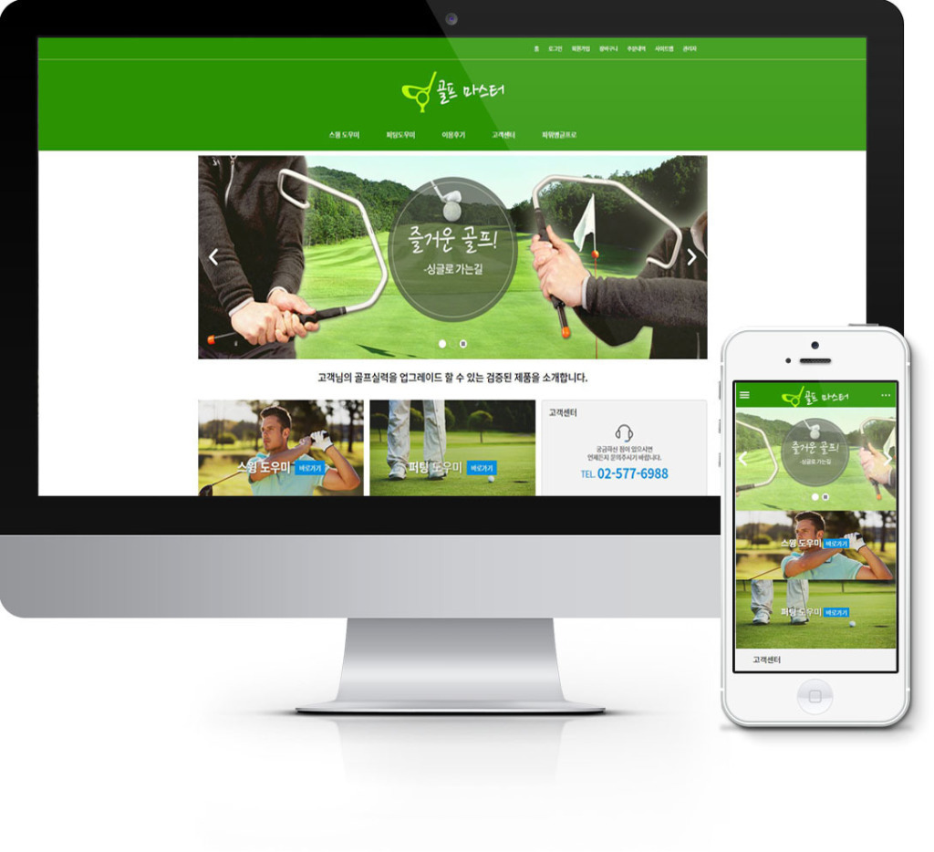 메인의 슬라이드쇼에도 골프 관련 이미지를 배치하여 골프관련 홈페이지 이미지를 한눈에 확인할 수 있습니다. 전반적으로 홈페이지 메인컬러를 그린색으로 배치하여작업하였으며, 골프 마스터 상품을 메인페이지 중앙에 배치하여 골프용품을 메뉴에 연결하지 않아도 바로 갈 수 있도록 구성하였습니다.